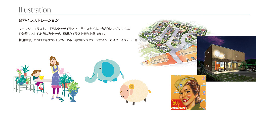 ファンシーイラスト、リアルタッチイラスト、テキスタイルから3Dレンダリング等、