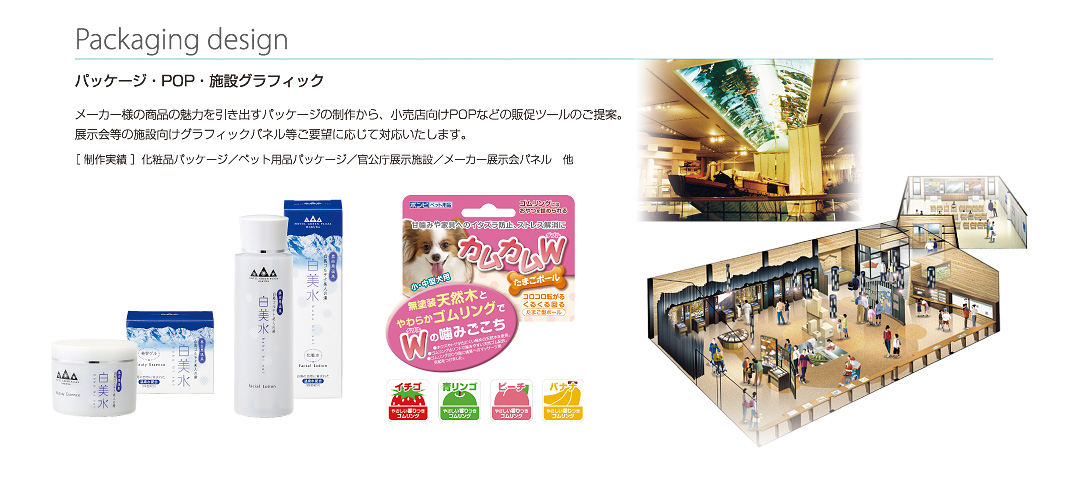 [ 制作実績 ]化粧品パッケージ/ペット用品パッケージ/官公庁展示施設/メーカー展示会パネル 他